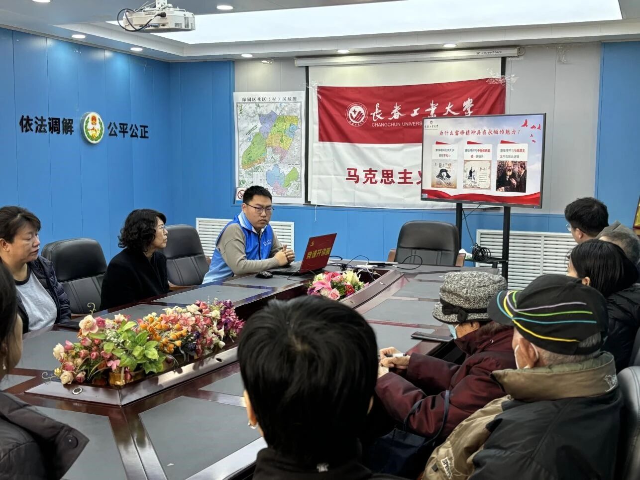 3月4日上午,学生志愿者武旭龙在铁西街道青浦社区以“新时代弘扬践行雷锋精神”为主题进行了宣讲。武旭龙同学结合马克思主义理论分析方法,围绕雷锋同志的生平事迹、雷锋精神的时代内涵以及在新时代如何传承和弘扬雷锋精神进行了宣讲。
