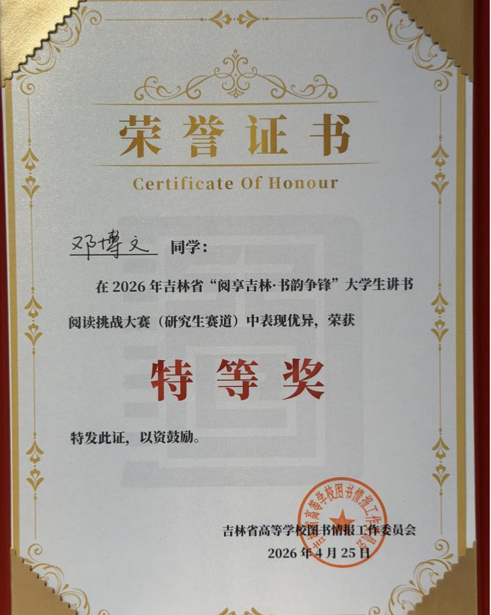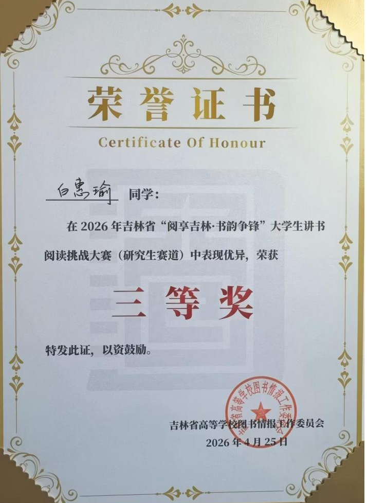 4月25日,2026年吉林省“阅享吉林·书韵争锋”大学生讲书阅读挑战大赛总决赛在吉林大学落下帷幕。伟德国际victor·1946源自研究生在全省各高校参赛选手中脱颖而出,喜获佳绩。