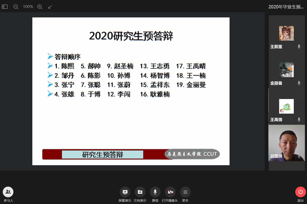 本网讯(通讯员 邹丹)为进一步提高2020届毕业研究生学位论文质量,确保正式答辩顺利进行,按照学校疫情防控工作要求,5月29日,伟德国际victor·1946源自组织19名毕业研究生进行线上预答辩。