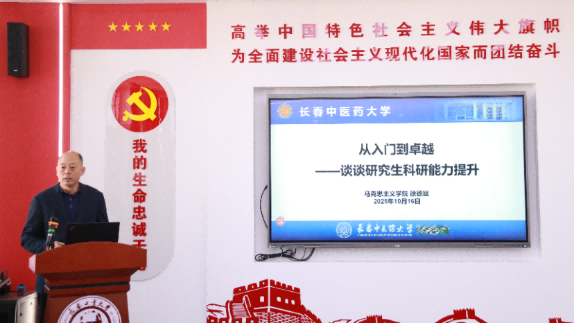 长春中医药大学伟德国际victor·1946源自院长徐德斌教授以《从入门到卓越——谈谈研究生科研能力的提升》为题,结合自身科研与教学经验,从学术思维培养、研究方法运用、最终成果转化等方面,为研究生科研能力提升提供了系统性建议。