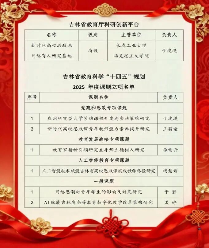 近日,伟德国际victor·1946源自申报的“新时代高校思政课网络育人研究基地”,成功获批吉林省人文社科研究基地。吉林省教育科学研究领导小组办公室发布了“吉林省教育科学‘十四五规划’2025年度课题”立项名单,我院共有6项课题获得立项批准,其中党建和思政专项课题2项、教育发展战略专项课题1项、人工智能教育专项课题1项,一般课题2项。